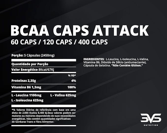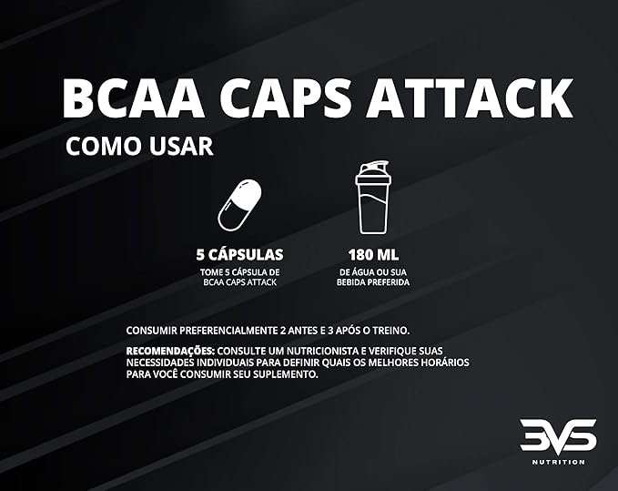 Porção recomendada ‎SUGESTÃO DE USO: Ingerir 5 cápsulas de BCAA Attack da 3VS Nutrition ao dia, preferencialmente 2 antes e 3 após o treino, ou seguindo orientação de médico/nutricionista.