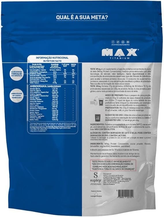 100% Whey Protein Concentrado Pote 900G da Max Titanium é a escolha ideal para quem busca uma proteína de alta qualidade para potencializar os seus objetivos de treino. Composto por proteína concentrada do soro do leite (WPC), este suplemento passa por um avançado processo de filtração que preserva nutrientes essenciais, como proteínas, lactose e minerais, enquanto reduz a quantidade de gordura e carboidratos. Cada porçãodose oferece até 20g de proteína, auxiliando no ganho de massa muscular, recuperação pós-treino e manutenção da massa magra.