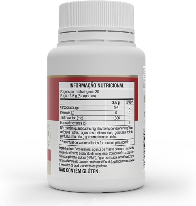 É um suplemento alimentar em cápsulas, que contém alta concentração do aminoácido beta-alanina, com zero adição de açúcares e corantes artificiais. Produto vegano. Não contém glúten