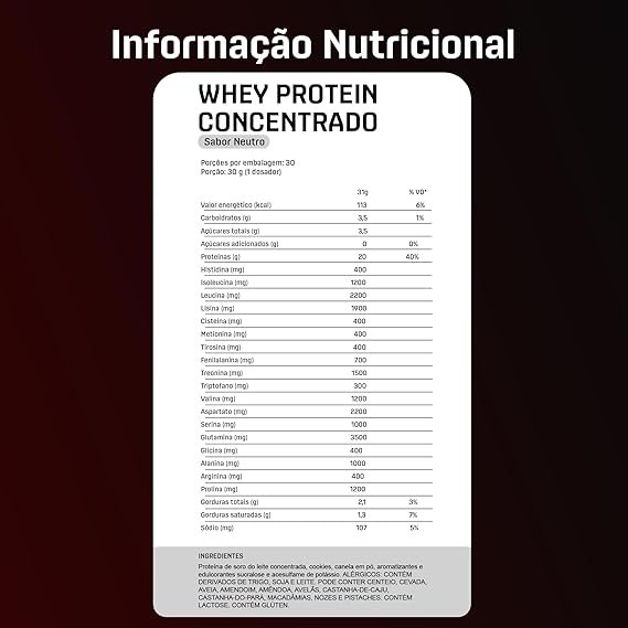 Proteína concentrada do soro do leite e emulsificante lecitina de soja. CONTÉM LACTOSE. CONTÉM GLÚTEN. ALÉRGICOS: CONTÉM DERIVADOS DE LEITE E SOJA. PODE CONTER TRIGO, AVEIA, CEVADA, CENTEIO, AMENDOIM, AVELÃ, MACADÃMIA, NOZES, CASTANHA-DE-CAJU, E CASTANHA-DO-PARÁ.